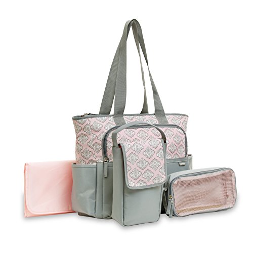 If you're looking for something less floral or feminine, there's an entire subindustry aimed at designing diaper bags for dads. Ju-Ju-Be carries the Be Hip messenger bag in slate and timber colors, for example. Storksak carries the Jamie bag made of cowhide and big enough to fit a laptop along with the nappies. And DadGear messenger bags can be found decorated with flames and skulls, if you're so inclined. Just keep in mind that a bigger investment might not deliver a bigger return in terms of convenience or durability. And remember that a diaper bag can get dirty and worn pretty quickly.Carter's Diaper Bag, Grey/Pink will help your job easier dexCarters Multi Piece Fashion Diaper Bag Set. Carry everything you will need for a day out and about, or even a little longer. The large tall top handle fashion tote diaper bag ( 16" w x 12" h x 5.5 d) in Grey and Pink Tile Print has an tip zip opening into a large main storage compartment . 5 Exterior Pockets give easy access to all of mom's and babies needs, including bottles, diapers, wipes, and more. The set includes a top flap and carry handle diaper changer kit (5" x 10" h x 2.5" d) along with a hard wipes storage dispenser. Also a storage cube with zip close mesh top (5" w x 10"h x 2" d) great for change of clothes, food, and more. The diaper changer pad is wipable and coordinates to complete the set.