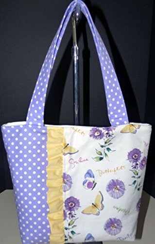 If you're looking for something less floral or feminine, there's an entire subindustry aimed at designing diaper bags for dads. Ju-Ju-Be carries the Be Hip messenger bag in slate and timber colors, for example. Storksak carries the Jamie bag made of cowhide and big enough to fit a laptop along with the nappies. And DadGear messenger bags can be found decorated with flames and skulls, if you're so inclined. Just keep in mind that a bigger investment might not deliver a bigger return in terms of convenience or durability. And remember that a diaper bag can get dirty and worn pretty quickly.NEW Handmade Lavender Spring Butterfly Floral Tote Handbag Purse Diaper Bag will help your job easier dexLadybug & Butterfly Floral Handbag by Look at Me Keepsakes This adorable handbag can be used as a carry-all or diaper bag. It is made from a lovely lavender & yellow butterfly cotton print and lavender polka-dot fabric. It is adorned with a yellow ruffle and it is made with a soft fleece pellon so the bag stands on its own. The lining is a double-sided white cotton quilted fabric with three pockets to keep you organized. It has an invisible magnetic snap to keep everything inside and a plastic covered sleeve to keep the bottom stable. Measurements: Bag Length: 13 3/4" tapering to 10" Bag Height: 10 3/4" Bag Depth: 4" Strap Drop: Approximately 9"