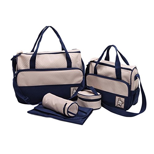 If you're looking for something less floral or feminine, there's an entire subindustry aimed at designing diaper bags for dads. Ju-Ju-Be carries the Be Hip messenger bag in slate and timber colors, for example. Storksak carries the Jamie bag made of cowhide and big enough to fit a laptop along with the nappies. And DadGear messenger bags can be found decorated with flames and skulls, if you're so inclined. Just keep in mind that a bigger investment might not deliver a bigger return in terms of convenience or durability. And remember that a diaper bag can get dirty and worn pretty quickly.Outtop Mommy's Multi-functional 5 in 1 Diaper Tote Bags[Changing bag-large][Changing bag-small][Bottle holder][Food Pouch][Changing Matt] Baby Supplies Set (DarkBlue) will help your job easier dexProduct Features: