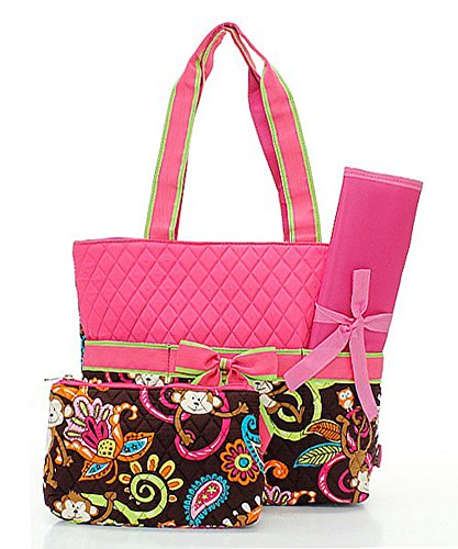 If you're looking for something less floral or feminine, there's an entire subindustry aimed at designing diaper bags for dads. Ju-Ju-Be carries the Be Hip messenger bag in slate and timber colors, for example. Storksak carries the Jamie bag made of cowhide and big enough to fit a laptop along with the nappies. And DadGear messenger bags can be found decorated with flames and skulls, if you're so inclined. Just keep in mind that a bigger investment might not deliver a bigger return in terms of convenience or durability. And remember that a diaper bag can get dirty and worn pretty quickly.Monogram Ready Quilted Monkey Print 3pc Diaper Bag Set with Changing Pad and Small Zipper Tote will help your job easier dexThis beautiful 3 piece Diaper Bag set features the following: Zipper Top, Backside Zipper Pocket, 3 Open Pockets on Front, Changing Pad Included, Small Zipper Tote Included, Gingham Lining, Monogram Ready
